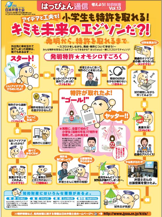 日本弁理士会では、若年層に広く知的財産のについて知ってもらうこと、教育関係者が知的財産に関し指導する際の支援を行うことを目的として、「はっぴょん通信」を作成しています。